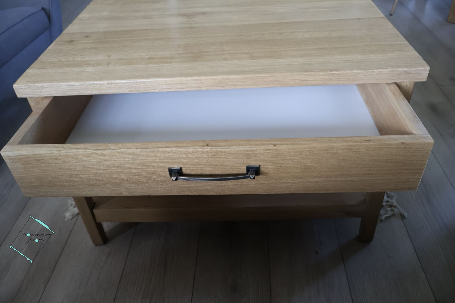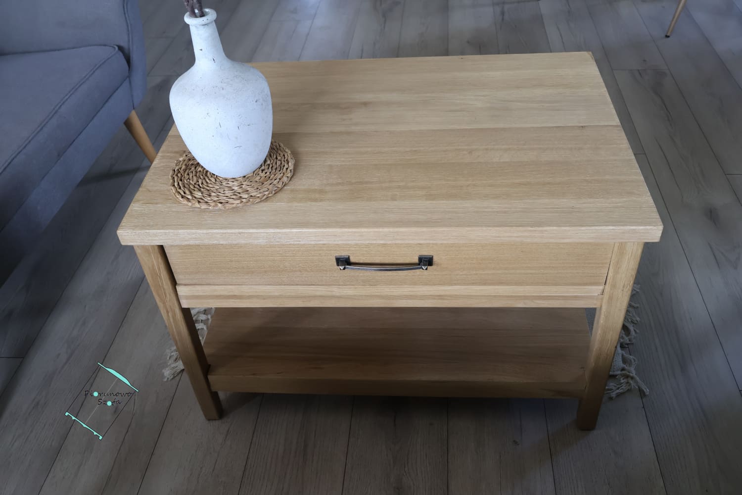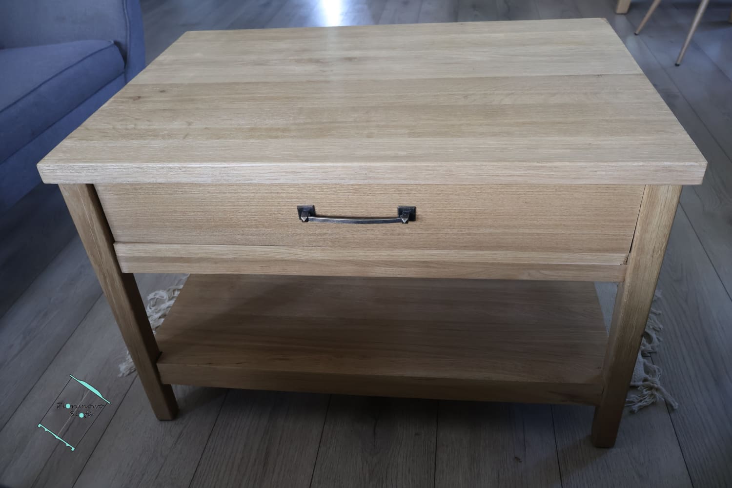 Drewniany stolik kawowy w naturalnym dębie łączy funkcjonalność z ciepłym, rustykalnym stylem. Dzięki praktycznej szufladzie i półce pomaga utrzymać porządek, a jednocześnie wprowadza przytulny i elegancki charakter do salonu lub sypialni.