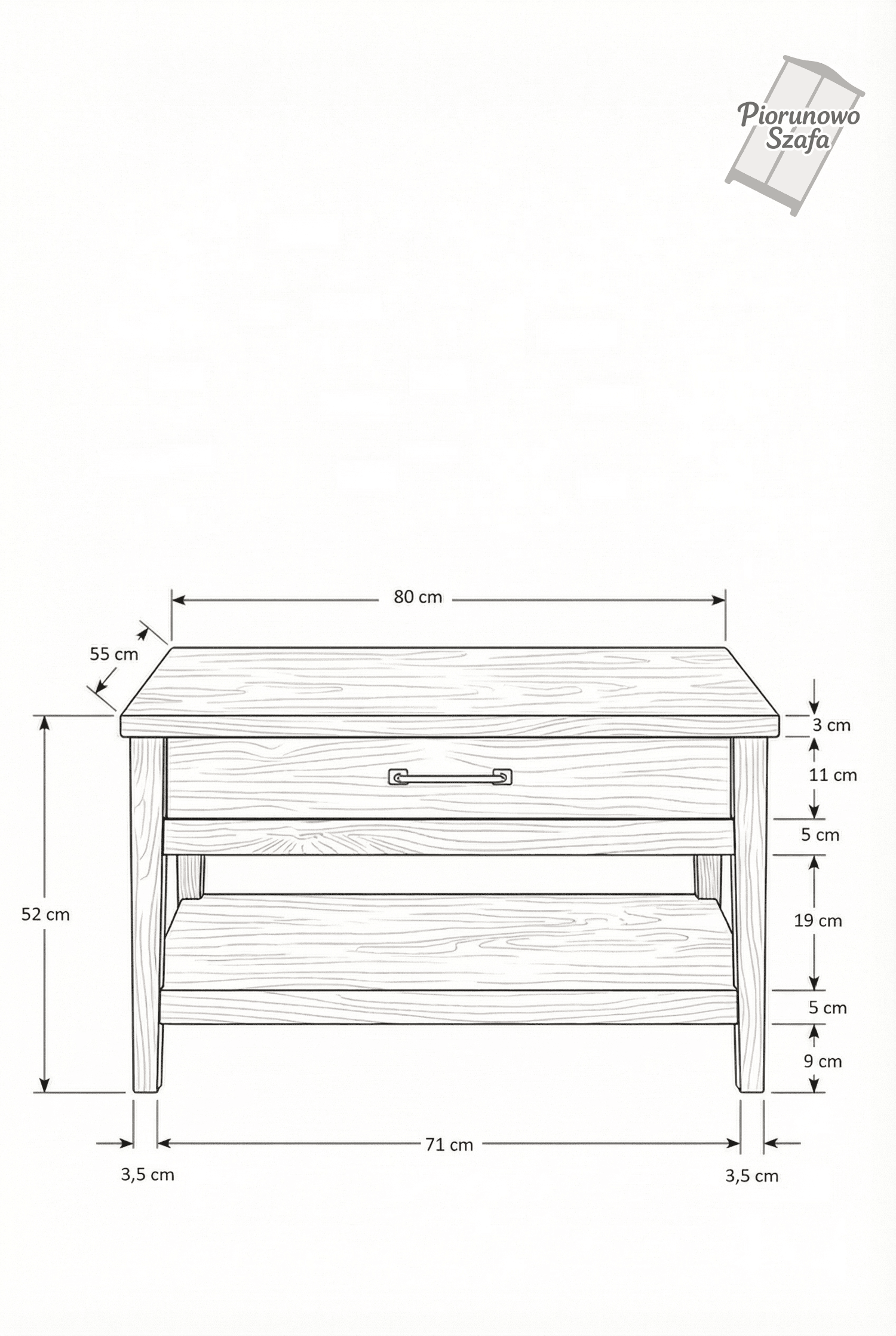 To wybór dla osób ceniących naturalne materiały i solidne wykonanie. W odróżnieniu od masowo produkowanych mebli, stolik oferuje unikalny charakter dzięki ręcznej obróbce drewna oraz praktyczne rozwiązania w postaci szuflady i półki. Zapewnia wygodę, porządek i ponadczasowy wygląd, który będzie pasować do różnych stylów wnętrz.
