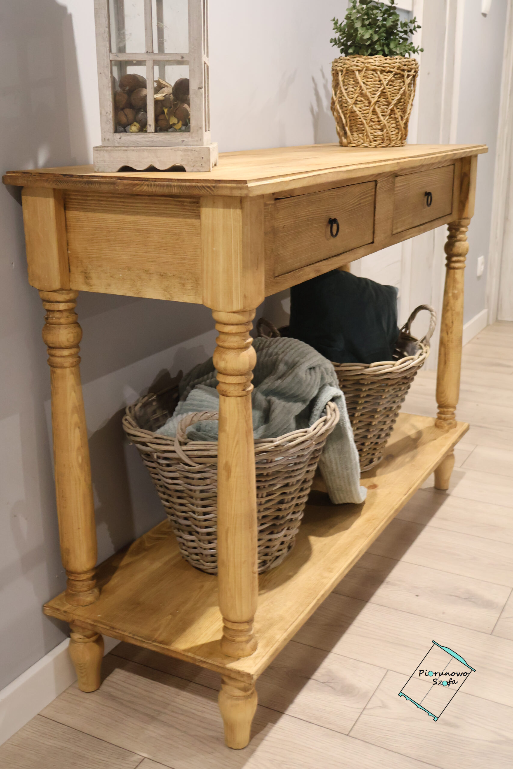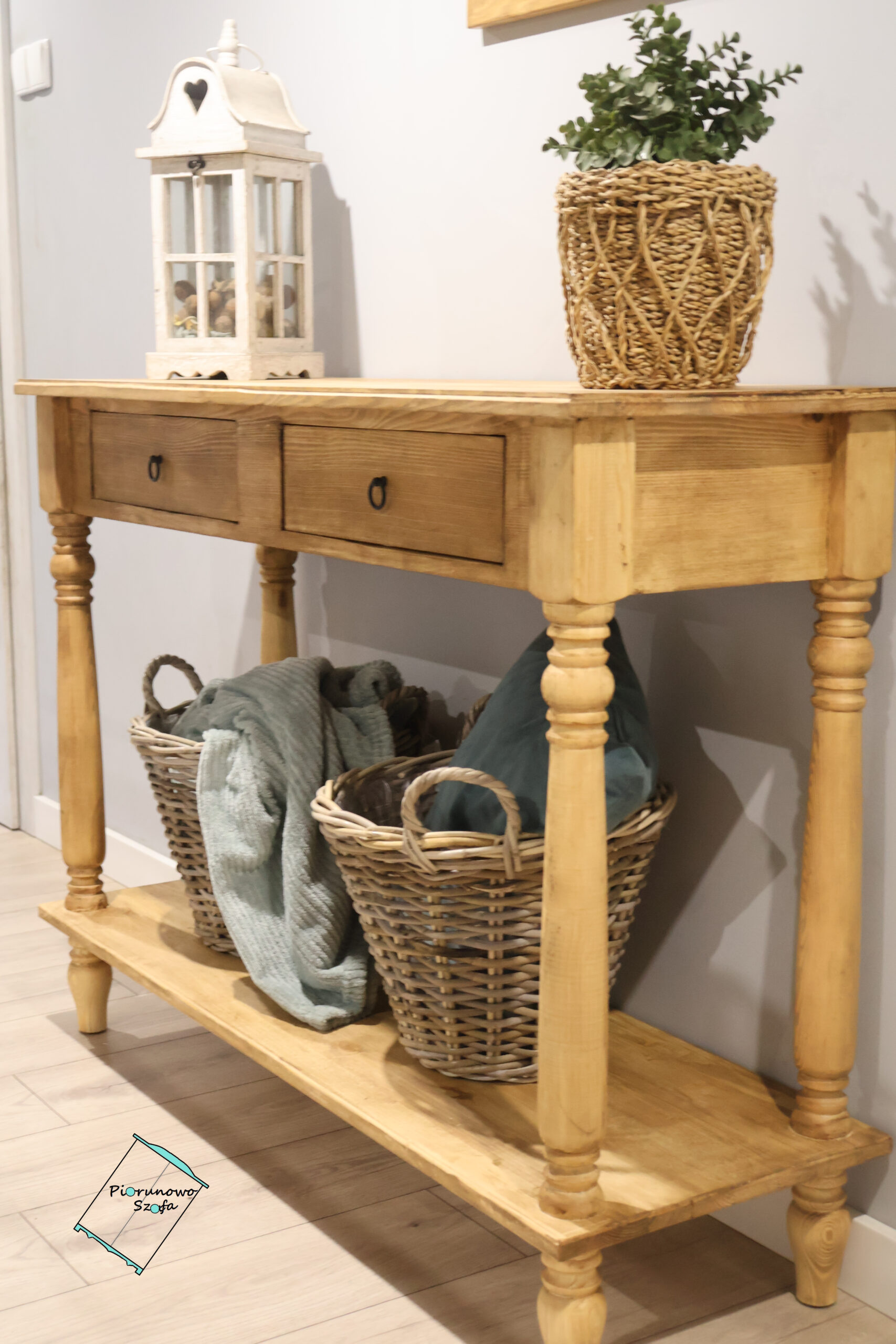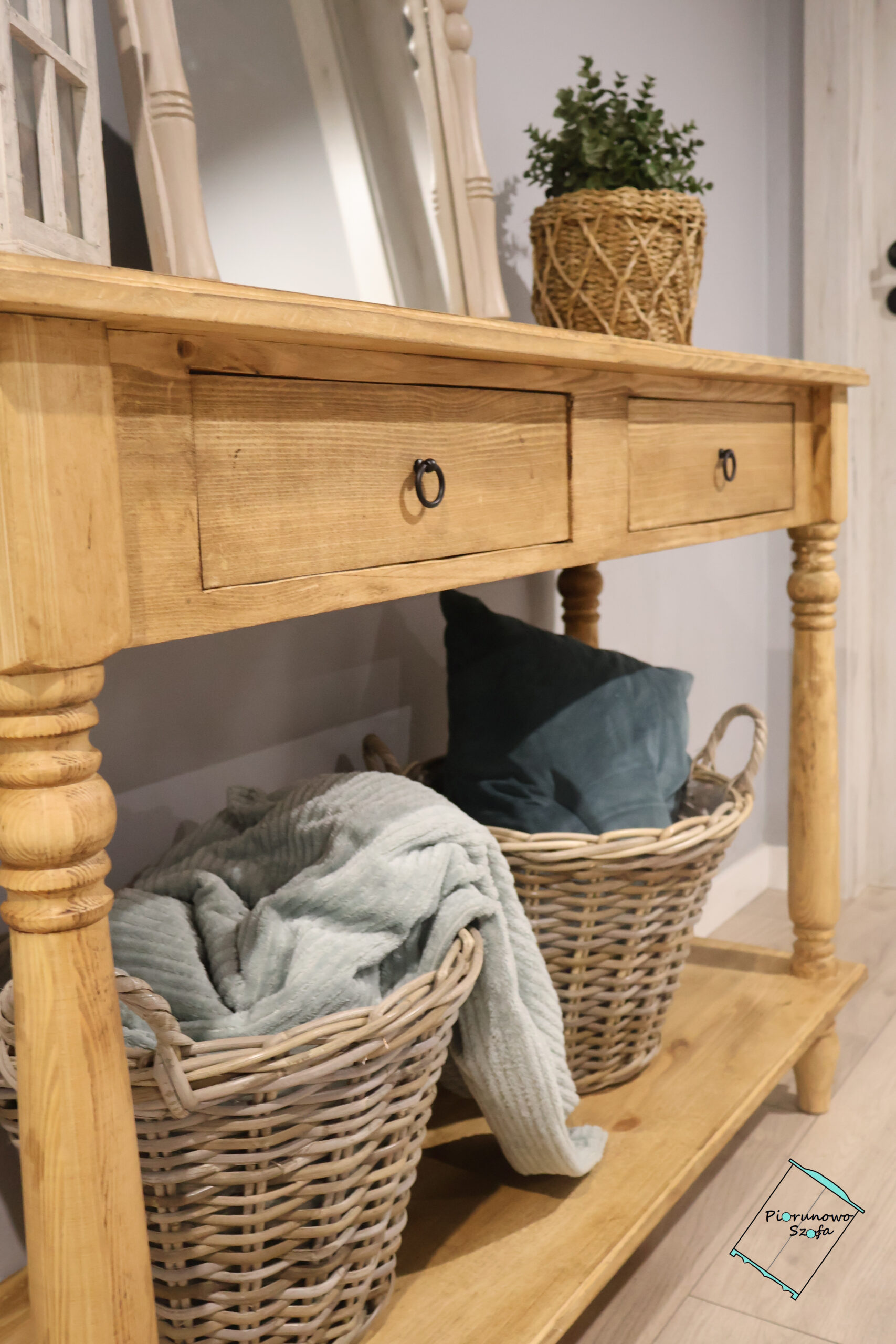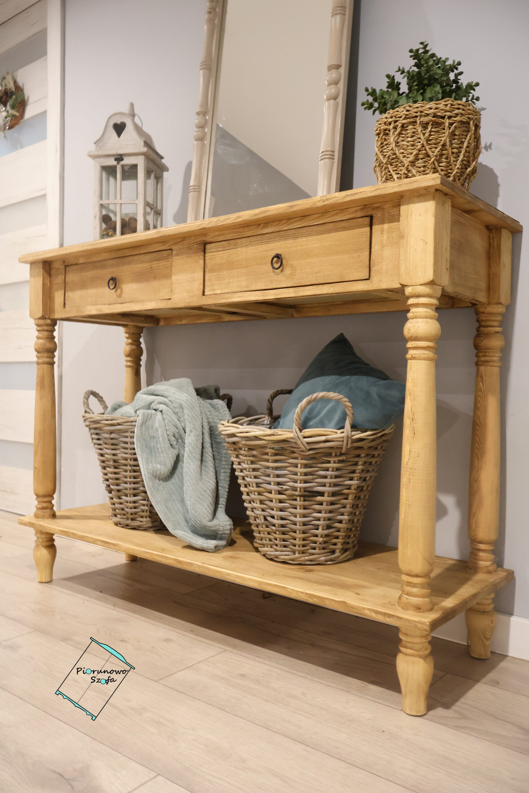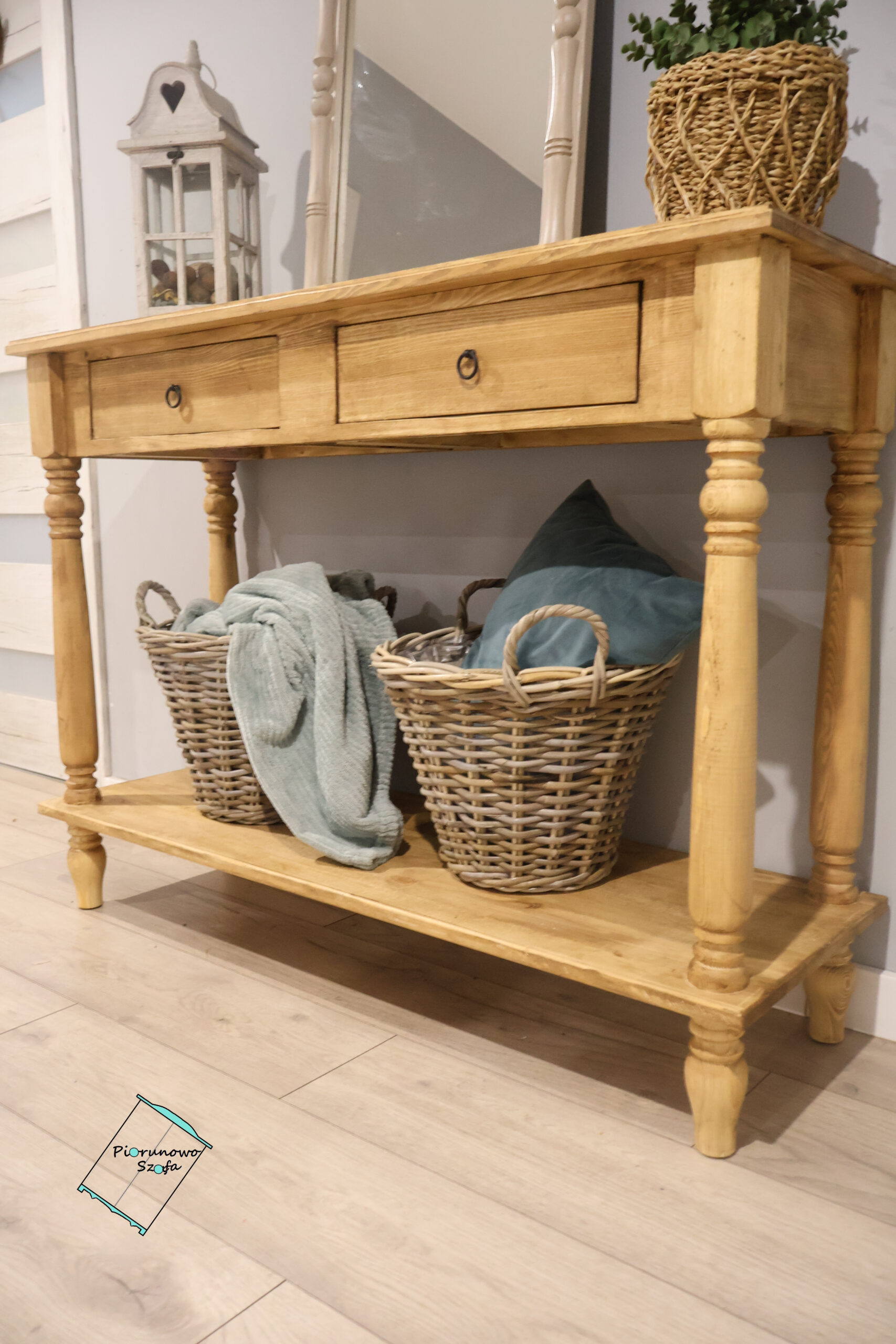 • Dodatki: Kompozycja na zdjęciu – lustro w drewnianej ramie, latarnia w stylu vintage oraz wiklinowe kosze – pokazuje, jak pięknie konsola wkomponuje się w przestrzeń z dodatkami o naturalnym charakterze.