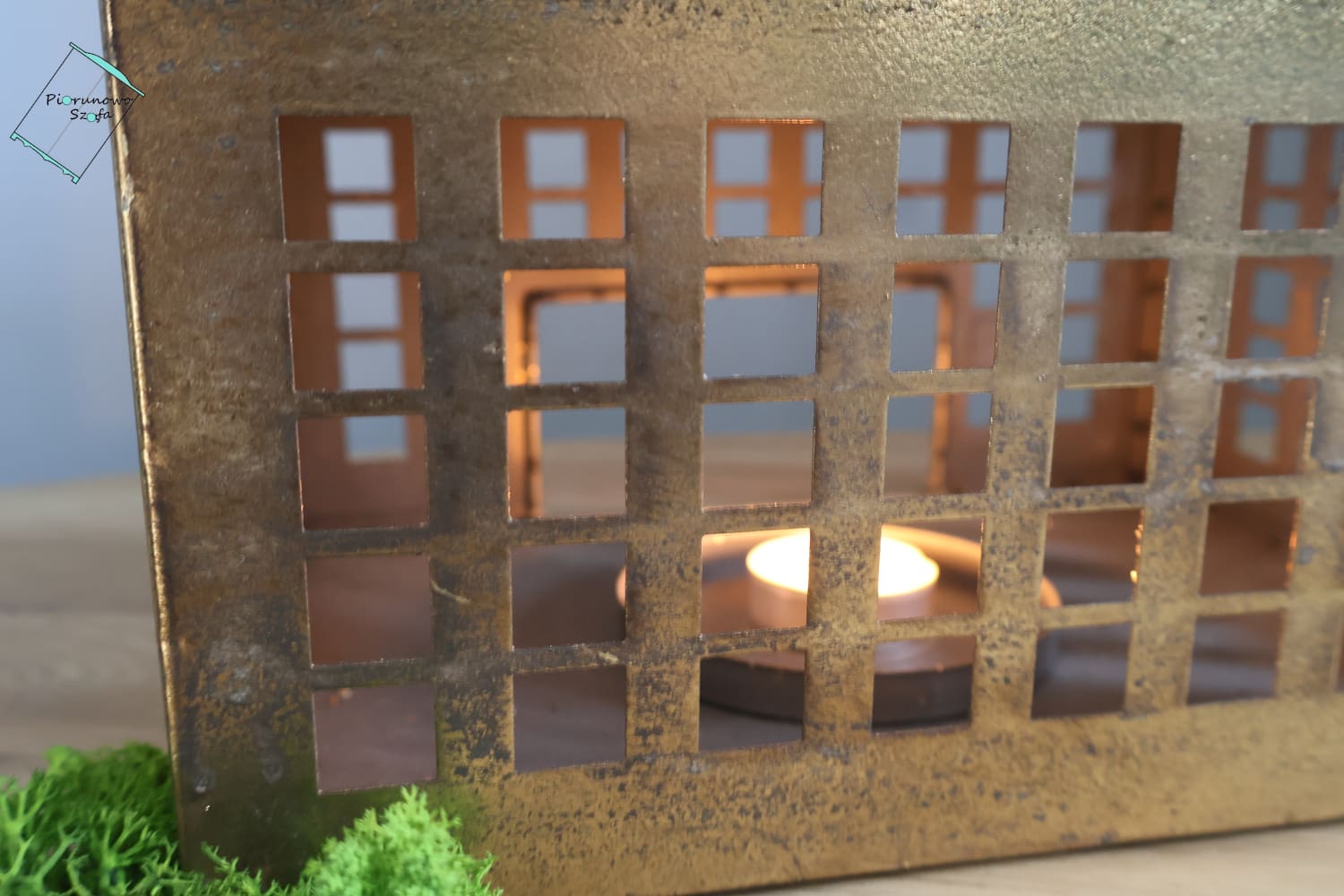 Metalowy lampion w złotym odcieniu świetnie utożsamia się ze stylem vintage, a światło świecy delikatnie rozprasza się przez ażurowe ścianki, tworząc ciepłą atmosferę.