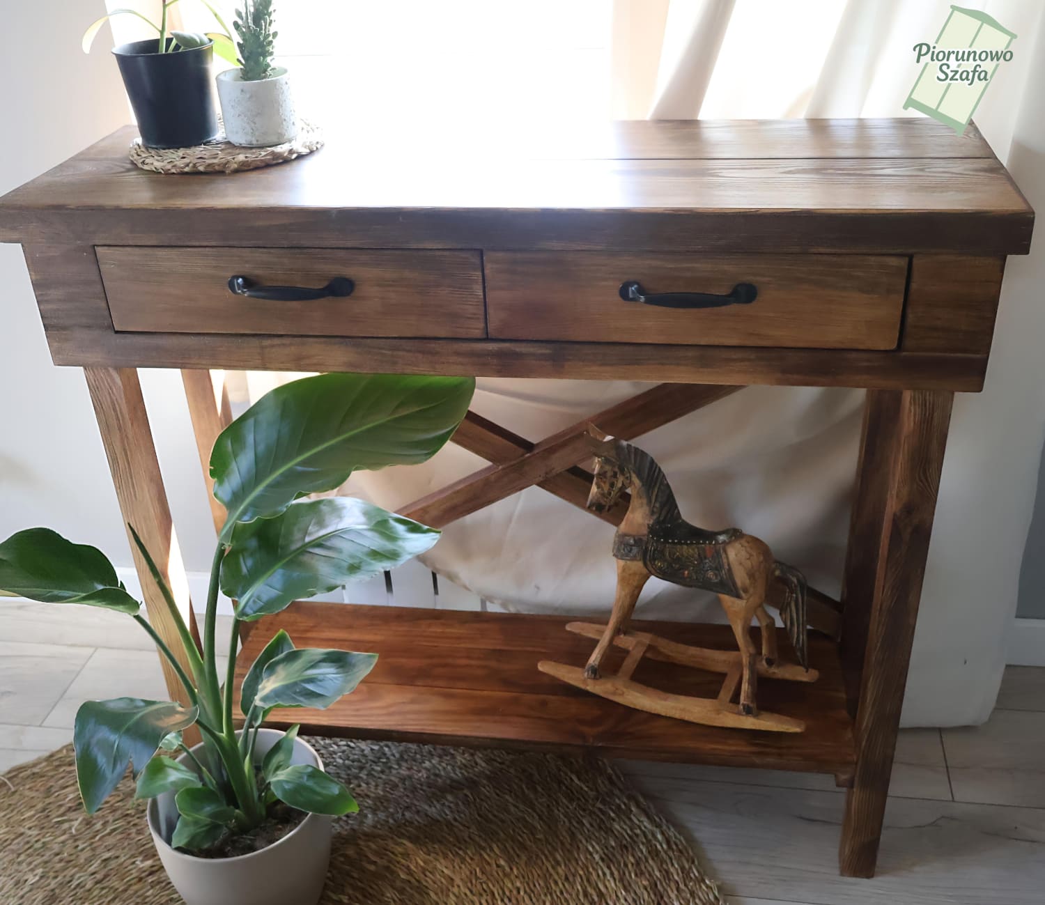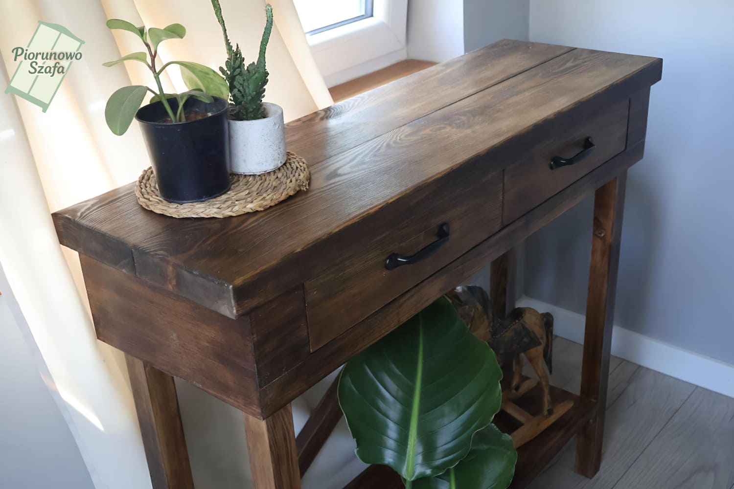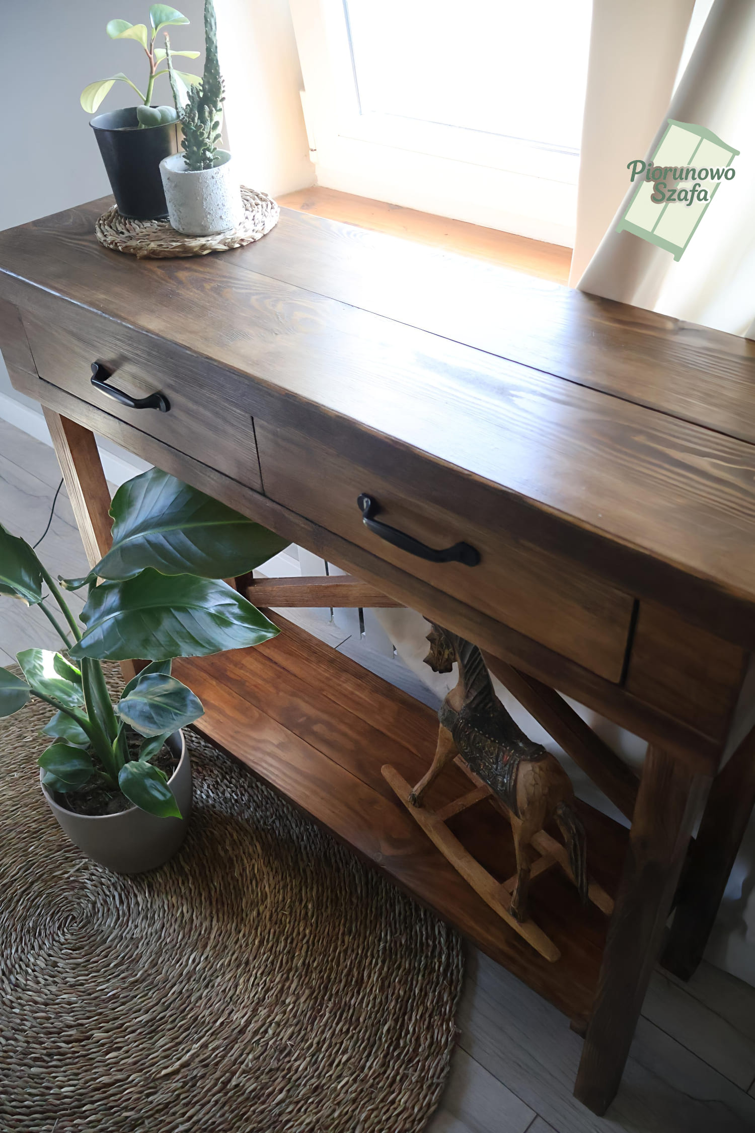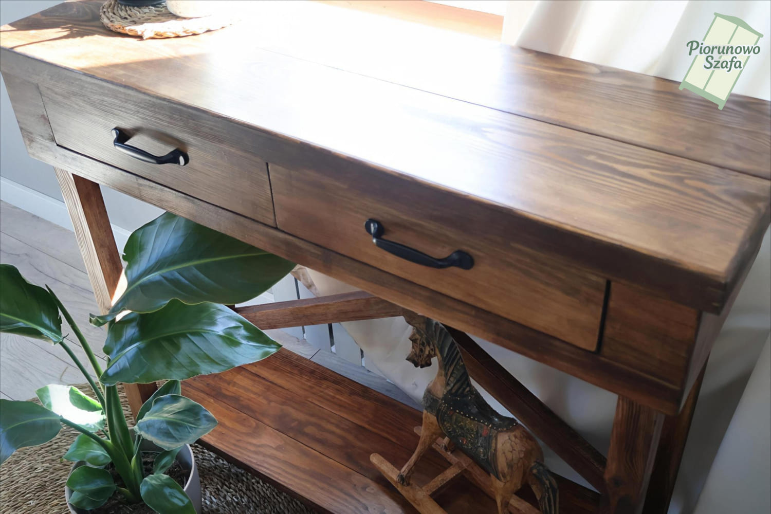 - Wyjątkowy design: Konsola wykonana z litego drewna w ciepłym odcieniu, o delikatnie postarzanym wykończeniu, nadającym jej unikalnego charakteru.